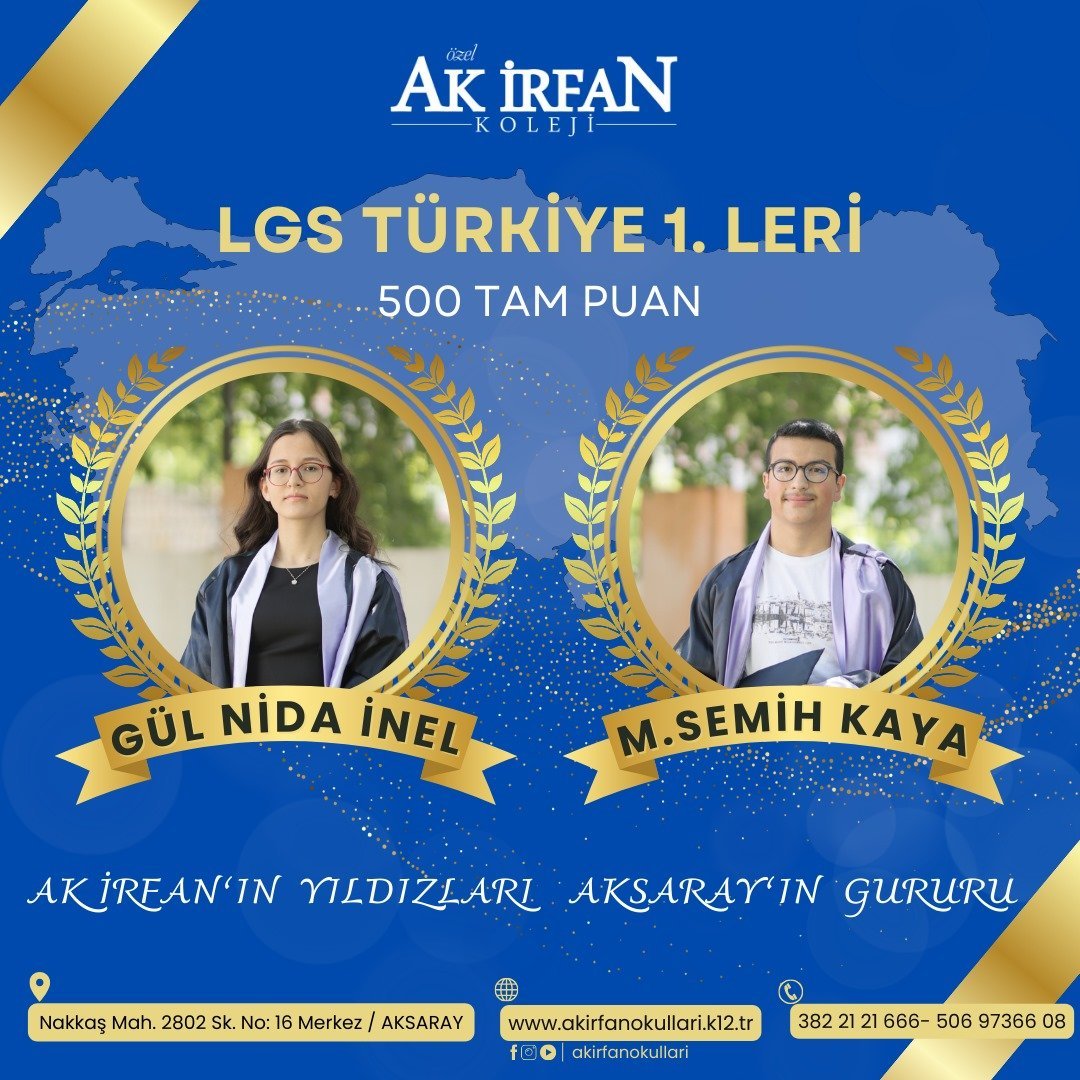 Bugün açıklanan LGS resmi sınav sonuçlarına göre öğrencilerimiz Gül Nida İNEL ve Muhammed Semih KAYA 500 tam puan alarak Türkiye birincisi olmuşlardır. Öğrencilerimizin başarısında emeği geçen öğretmenlerimize teşekkür ediyor, öğrencilerimizi ve ailelerini tebrik ediyoruz. Ak İrfan Koleji