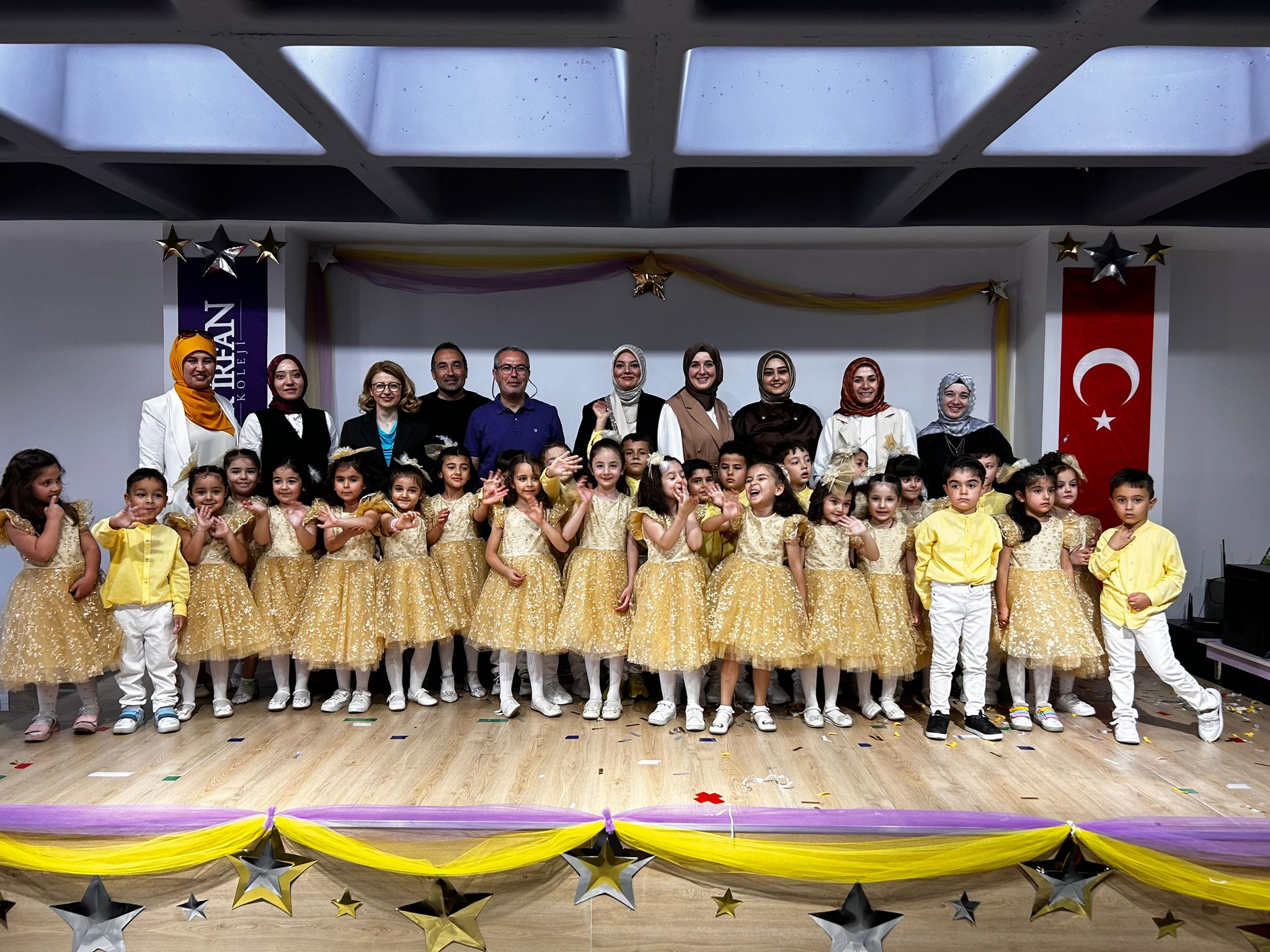 2023-2024 Eğitim- Öğretim yılı Anasınıfı öğrencilerimizin yılsonu gösterisi bugün düzenlenen muhteşem bir programla gerçekleşti. Program Saygı Duruşu ve İstiklal Marşının okunması ile başladı. Ardından Okul Müdürümüz Melek Kutay Dinler yaptığı konuşmada "Değerli velilerimiz, öğretmenlerimizin özverili çalışmaları, sizlerin de desteğiyle, miniklerimizin bir kısmı bu sene bir adım daha atarak ilkokula hazır hale geldiler. Küçük yaş öğrencilerimiz ise bir yıl daha okul öncesi eğitime devam edecek. İlkokula başlayacak öğrencilerimiz yeni maceralara atılacaklar, yeni bilgiler öğrenecekler ve yeni arkadaşlar edinecekler. Bizler de her zaman yanlarında olacağız ve onları bu yolda desteklemeye devam edeceğiz. Minik yavrularımızı bu güzel gün için tekrar tebrik ediyorum. Onların neşesi ve coşkusu hepimizi büyülüyor. Çocuklarımızın masum dünyalarında yer alabilmek bizler için ne büyük bir şans." dedi ve programın hazırlanmasında emeği geçen herkese teşekkür etti. Okul Müdürümüzün konuşmasının ardından Anasınıfı yılsonu programımızda, öğrencilerimizin sergilediği sahne performansları göz doldurdu. Gösterilerin ardından velilerimiz öğretmen ve öğrencileriyle fotoğraf çekinerek anılarına bir yenisini daha eklediler.
