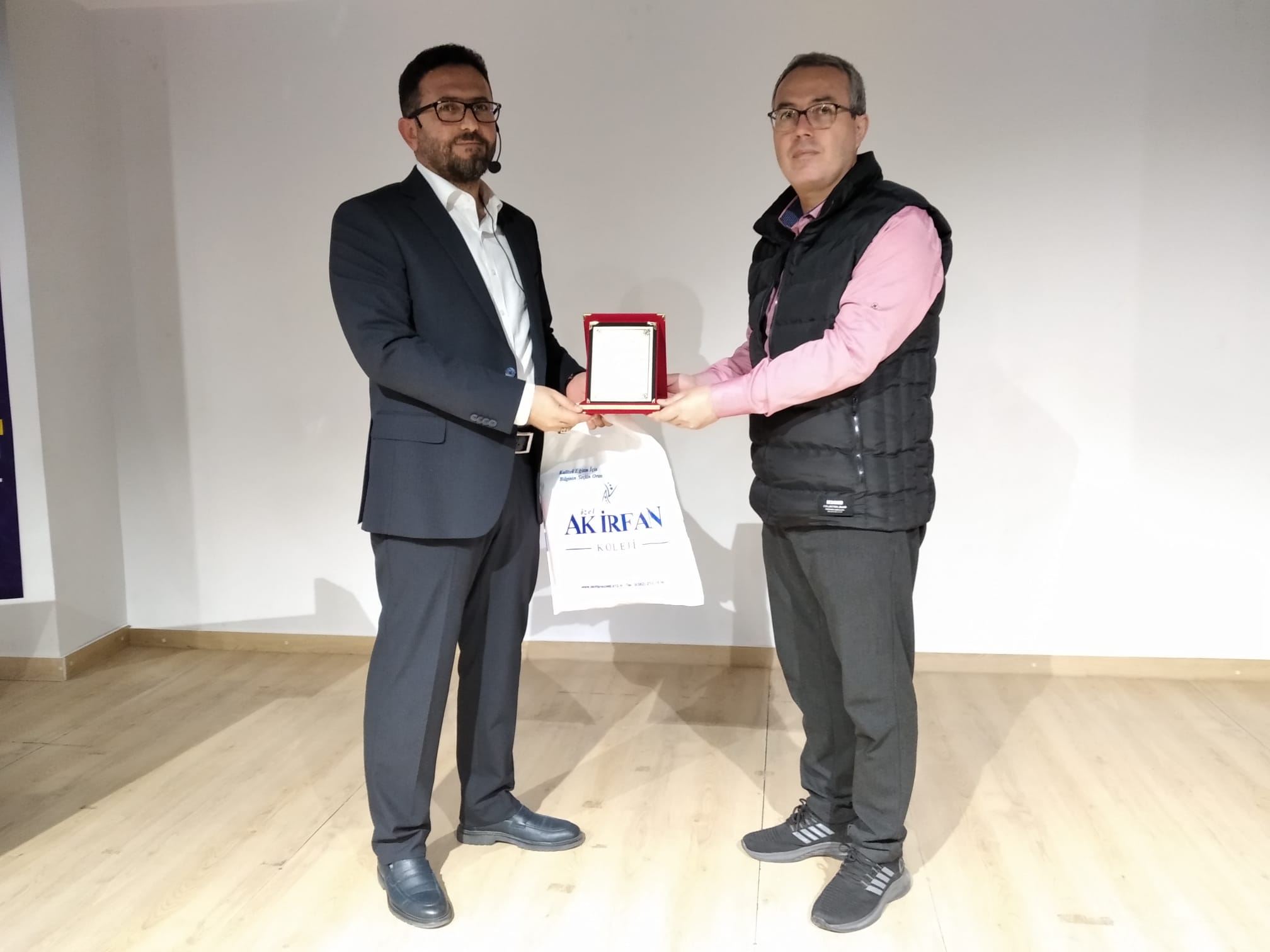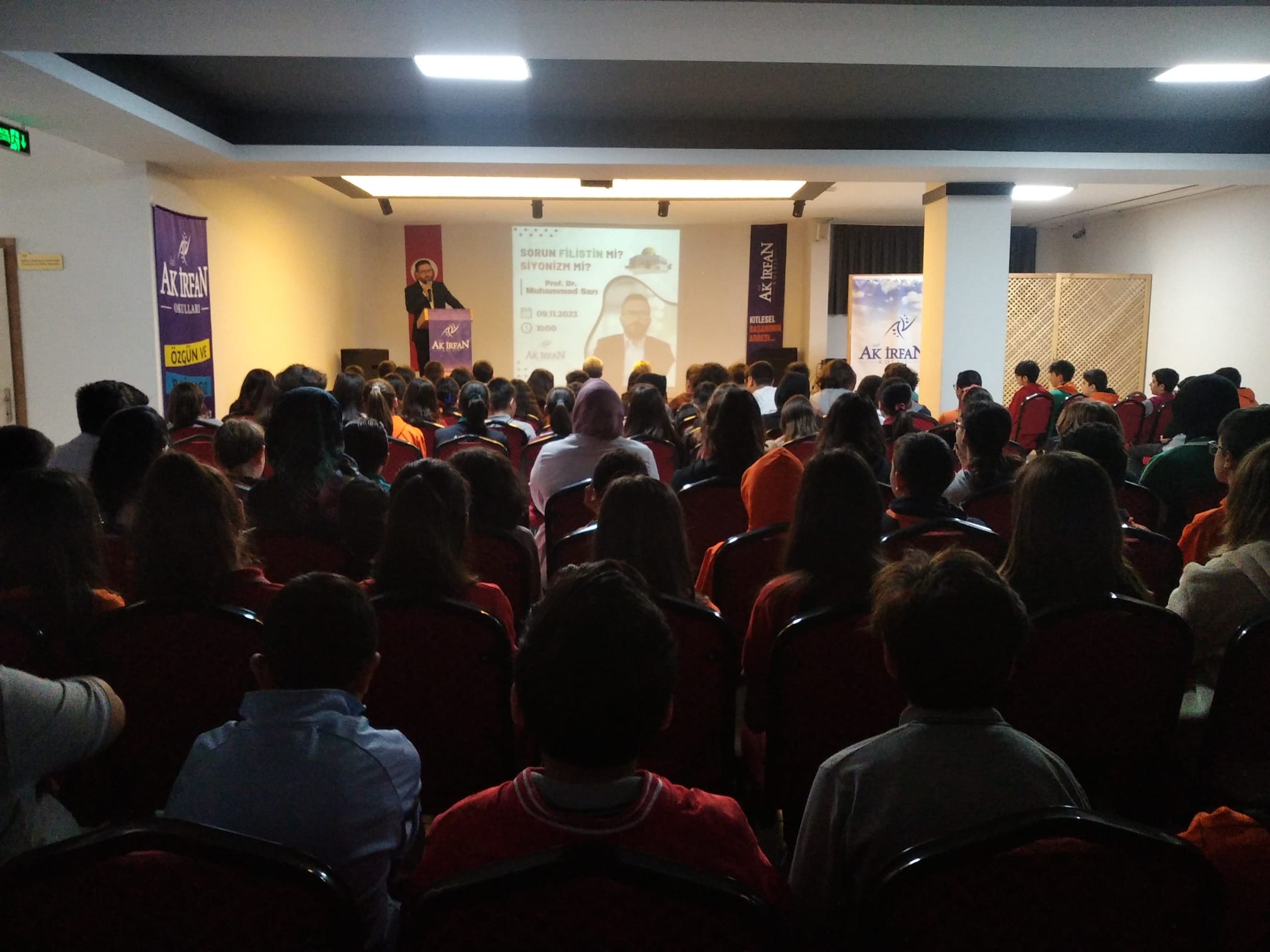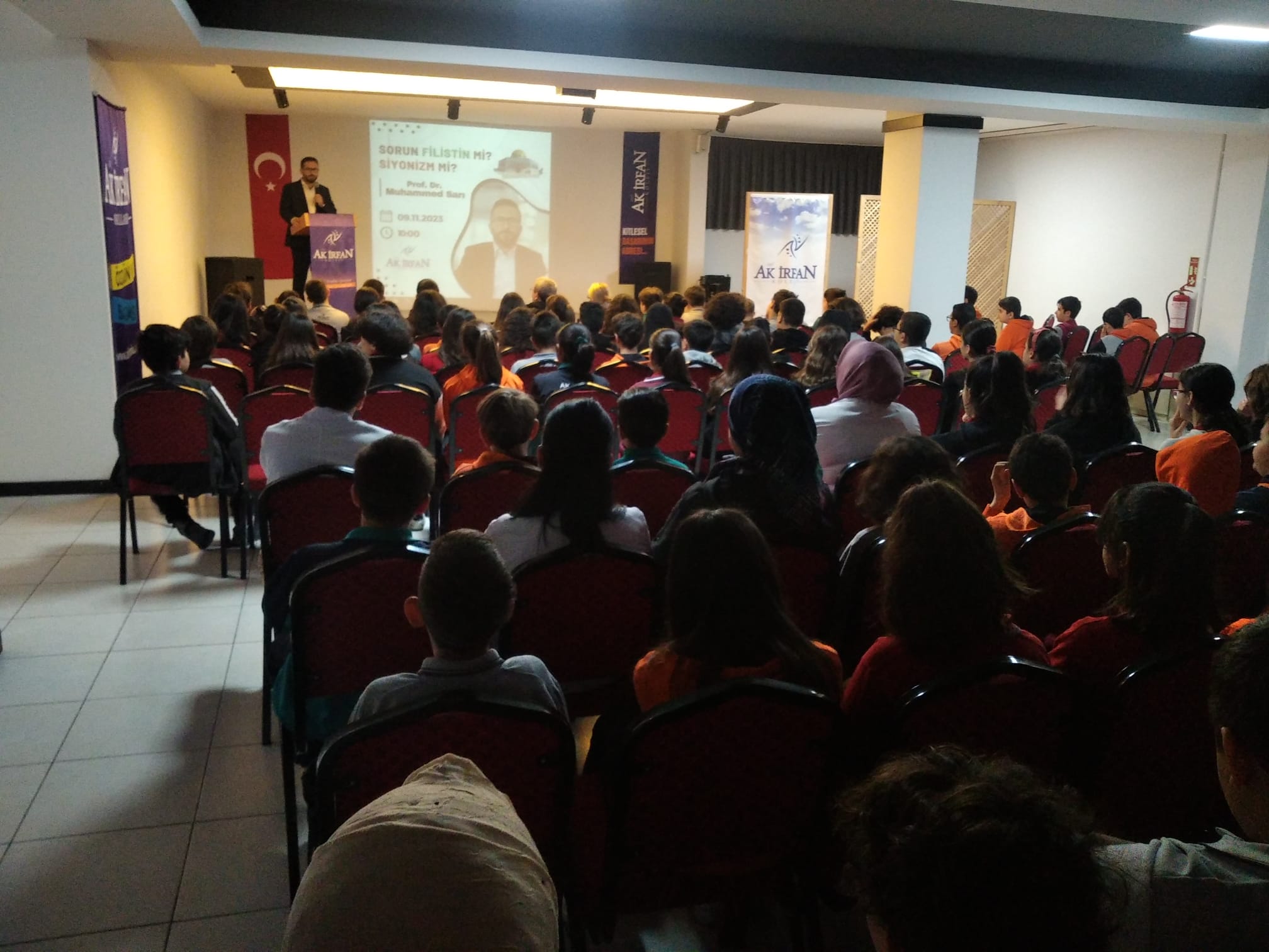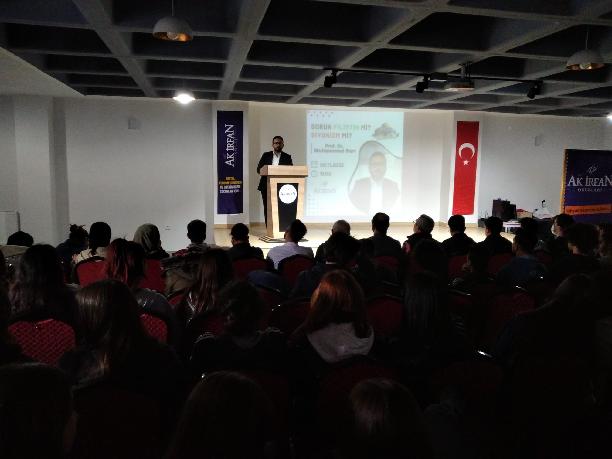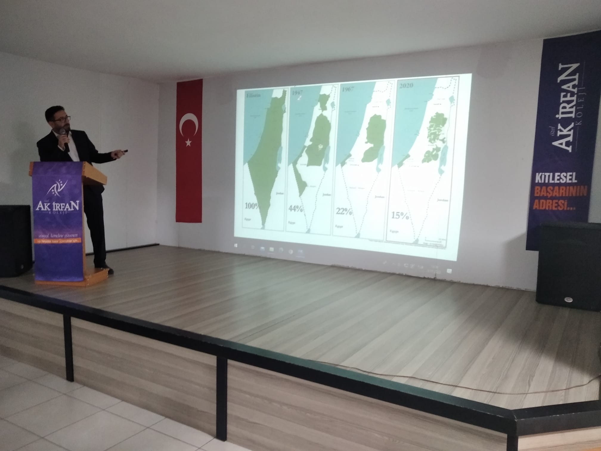Aksaray Üniversitesi Eğitim Fakültesi Yönetim Kurulu Üyesi Sayın Prof. Dr. Muhammed Sarı tarafından “Sorun Filistin mi? Siyonizm mi?” konulu konferans okulumuz konferans salonunda gerçekleşti. Konferans sonrasında öğrencilerimiz konu ile ilgili sorularını konuğumuza yönelttiler. Sunumundan dolayı Prof. Dr. Muhammed Sarı’ya okulumuz Yönetim Kurulu Temsilcisi Ali Özlük tarafından teşekkür plaketi verildi.